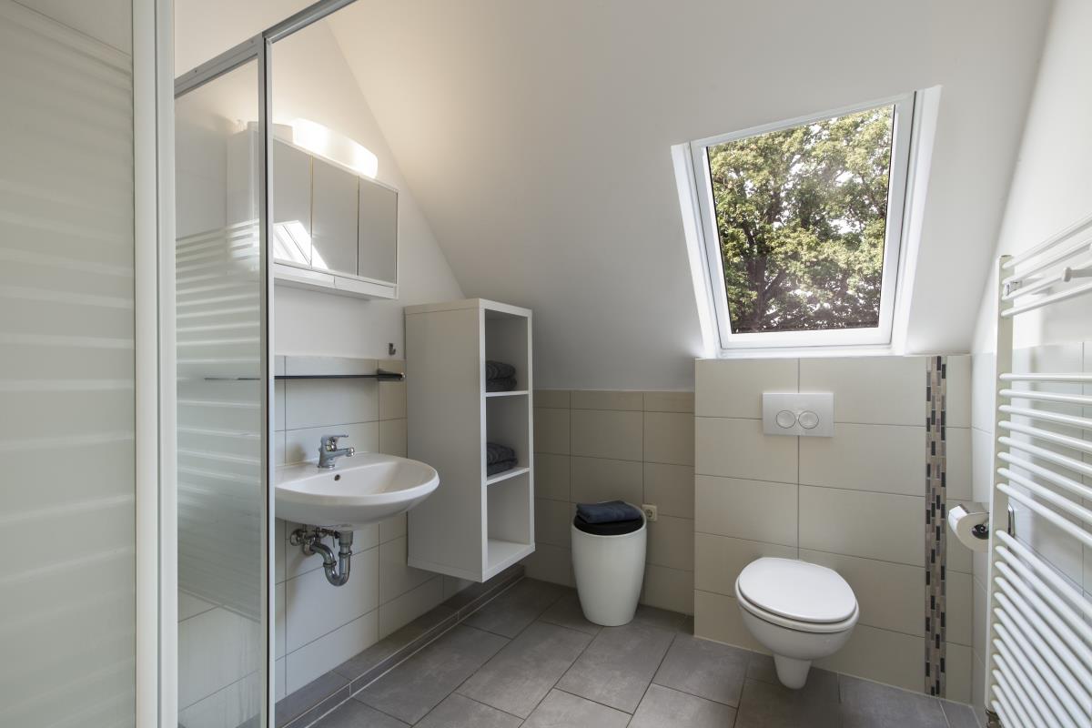 Das moderne Duschbad ist mit Waschmaschine und Trockner ausgestattet – ideal für längere Aufenthalte.
