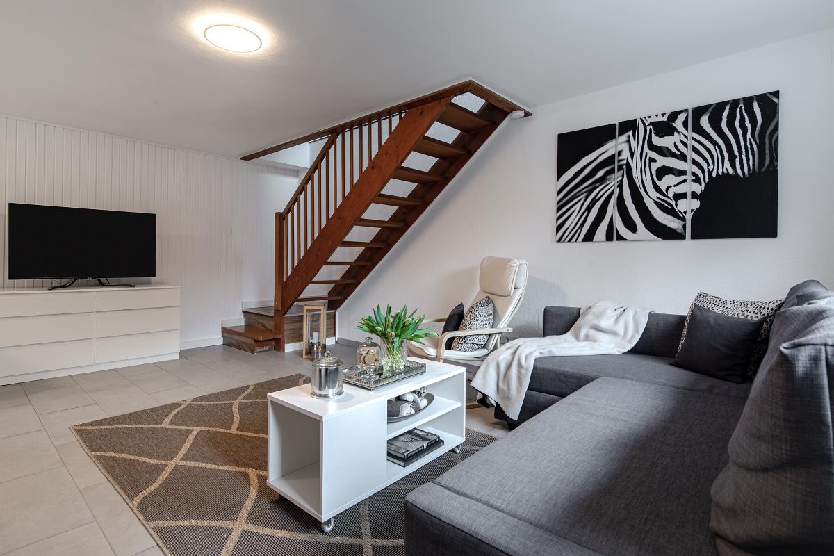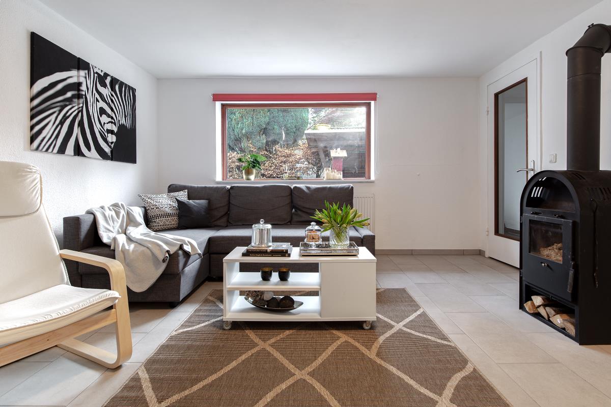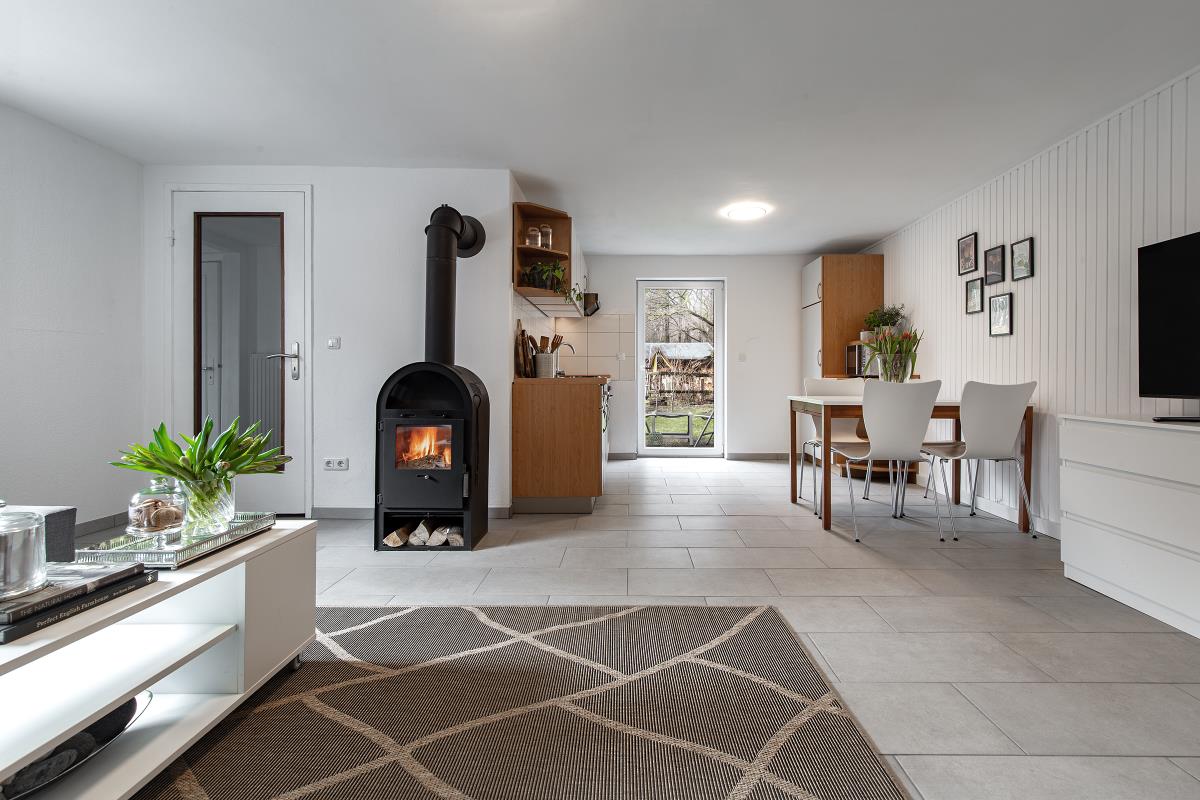 Helles Wohnzimmer mit gemütlichem Sofa (Schlafsofa 140x204cm) und Kamin für entspannte Abende