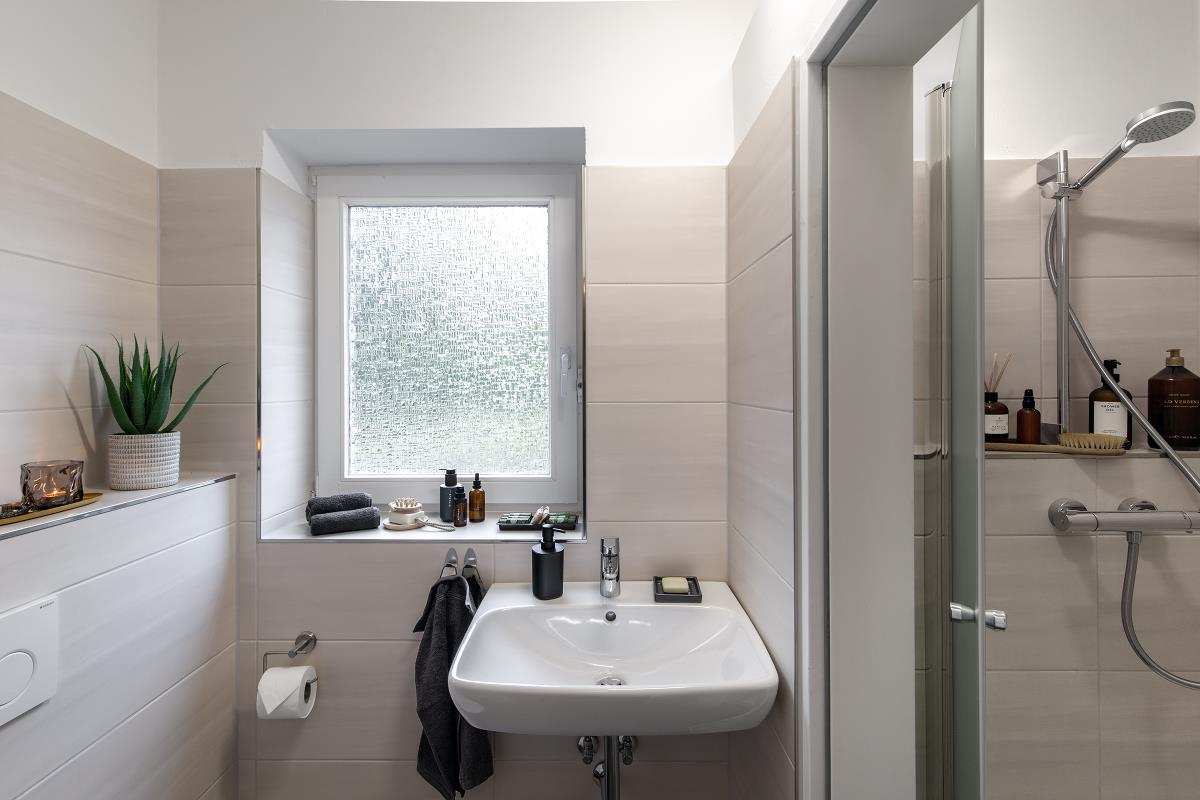 Modernes Duschbad mit frischen Handtüchern und Seife